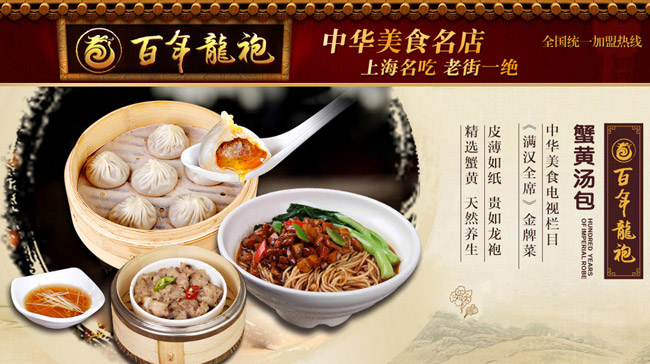 百年龙袍蟹黄汤包—汤包传奇 ——百年龙袍蟹黄汤包隶属于上海先豪餐饮管理有限公司,公司2002年成立以来一直以实体经营为主,是一家立足于上海、拓展海外和全国市场,致力于发展中式快餐品牌的餐饮管理公司,先后荣获上海市餐饮行业文明单位、上海著名餐饮品牌企业,七宝老街汤包在上海一直被评排名前十位,多次被评为上海名小吃、七宝老街名小吃、就业和社会保障知名民营企业等多项荣誉,百年龙袍蟹黄现已打进新加坡、香港、马来西亚等东南亚市场。